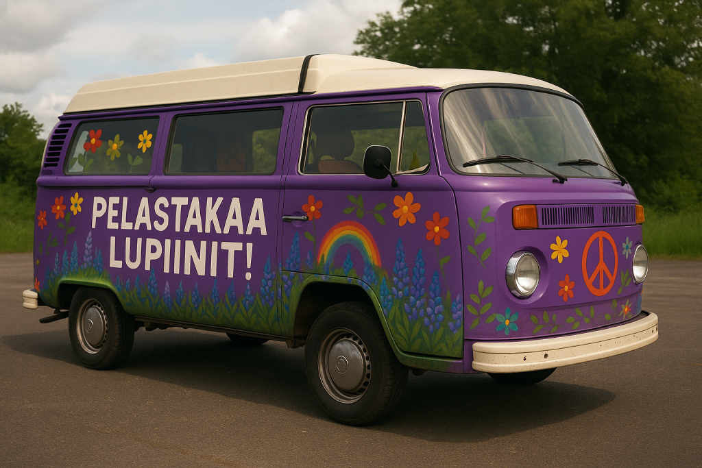 Kakella on mainostoimisto ja se teki mulle aikansa kuluksi sapluunat. Tää ”Pelastakaa Lupiinit!” on jostain syystä sellainen juttu, että kaikki haluaa auttaa ja olla mukana. Maalaaminen ei ollut iso juttu, mutta pohjatöitä sai tehdä useamman päivän ennen kuin tuli valmista. Laitoin paperit suojaksi ja ruiskutin ensin pohjan hekumallisen violetiksi. Sen jälkeen maalasin sapluunoiden avulla lupiiniaiheen auton molempiin kylkiin. Kake oli ehdottanut, että kukkia, sateenkaaria pitää olla riittävästi ja eteen keskelle tietenkin vanha kunnon ”Peace-merkki”. Näillä koristeilla kehtaa lähteä vaikka minkälaiseen mielenosoitukseen.