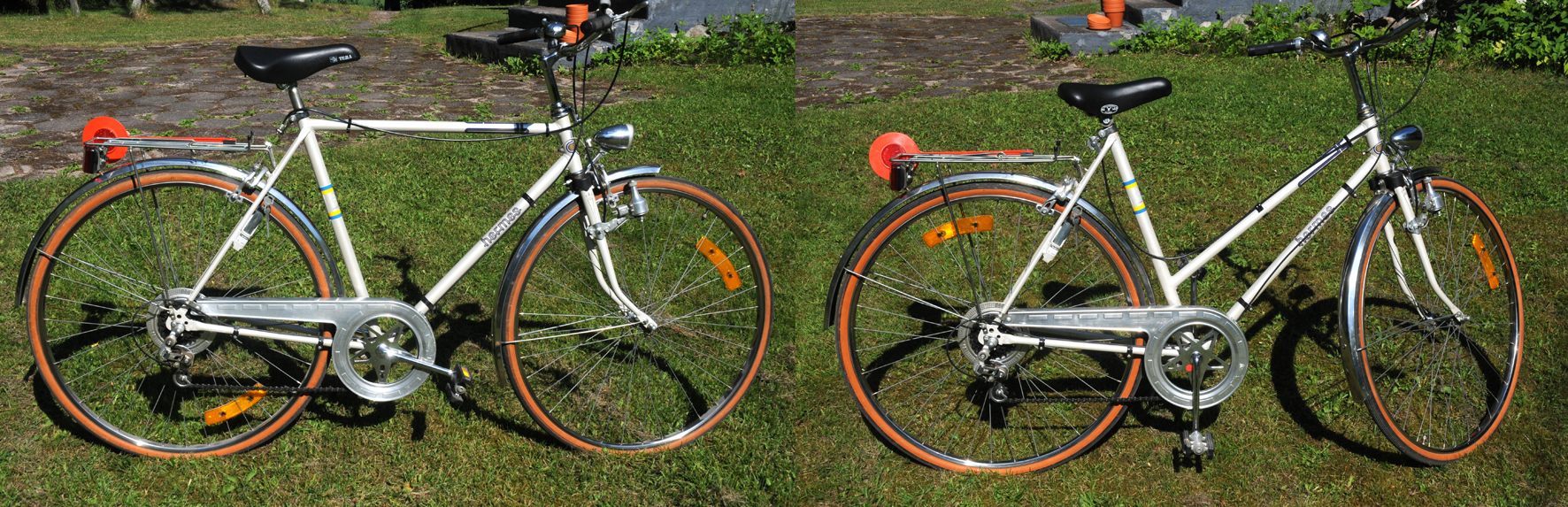 Tehtiin sitten niillä Hermes-fillareilla juhannusajelut aattona ja varsinaisena jussipäivänä. Kevyet noin 10 km pikkulenkit kesäisessä maalaismaisemassa. Ja hienostihan nuo aidot Shimano Positron-5 -vaihteistoilla varustetut retropyörät rullasivat. Ne ovat nimittäin 80-luvulta. Monark-Crescentin valmistetta ja ilmeiset harvinaisuudet. En löytänyt netistä tarkallakaan syynäyksellä yhtäkään vastaavaa fillaria. Ilmeisesti niitä ei myyty paljoa. Lapsuudestani muistan kyllä Hermes -merkin fillareista. Mutta ne ovat 50-luvun fillareita ja valmistaja ilmeisesti ei ollut Monark-Crescent. Niitä näkyy olevan myytävänä tori.fi:ssä. Nämä Hermeet ovat käytännössä täysin uudenveroiset. Olivat kuuluneet eräälle vanhalle parille, eivätkä niillä sitten paljon ajelleet. Olivat vuosikymmeniä tallissa keräämässä pölyä. Pojanpoika myi. Yhteishinta rajut 77 euroa.
