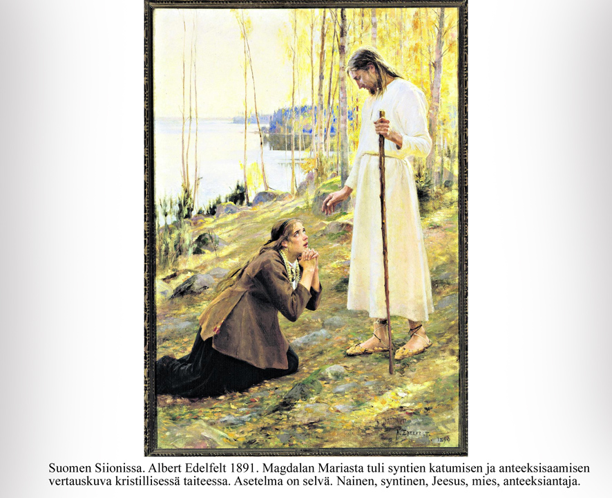 Yki, ehkäpä tulkintasi Edelfeltin kauniista maalauksesta on hiukkasen asenteellinen: Nainen, syntinen; Jeesus, mies, anteeksiantaja.