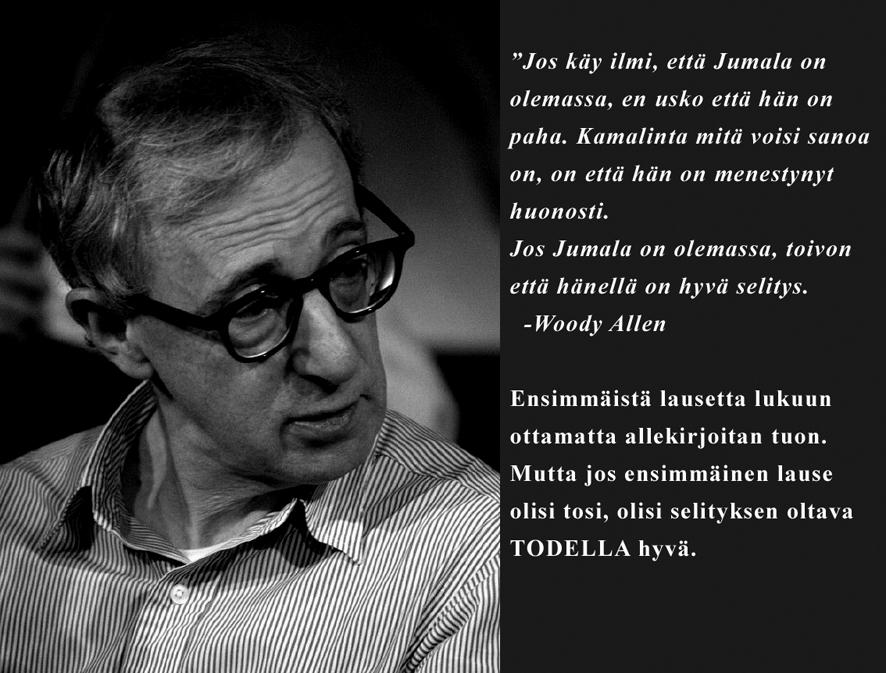 Maapallo on juuri sopivasti elämälle suotuisalla vyöhykkeellä. Luonnonlait ovat muotoontuneet sellaisiksi kuin ne ovat ja jos jokin parametri muuttuisi vähänkin, kaikki hajoaisi kuin Jokisen eväät. Tämän monet kristityt sanovat oleman todistus kaiken älykkäälle suunnittelijalle ja valmistajalle. Mutta miksei yhtä hyvin voisi sanoa, että tuon kaiken johdosta tälle planeetalle on muodostunut olento, jolla on kyky ajatella abstraktisti ja kehittää Jumala itselleen? Miksei yhtä hyvin kaikki on olemassa juuri siksi, että nuo parametrit ovat juuri kuten ovat? Voltaire huomautti aikanaan, että nenä on selvästikin suunniteltu sopimaan silmälaseihin.