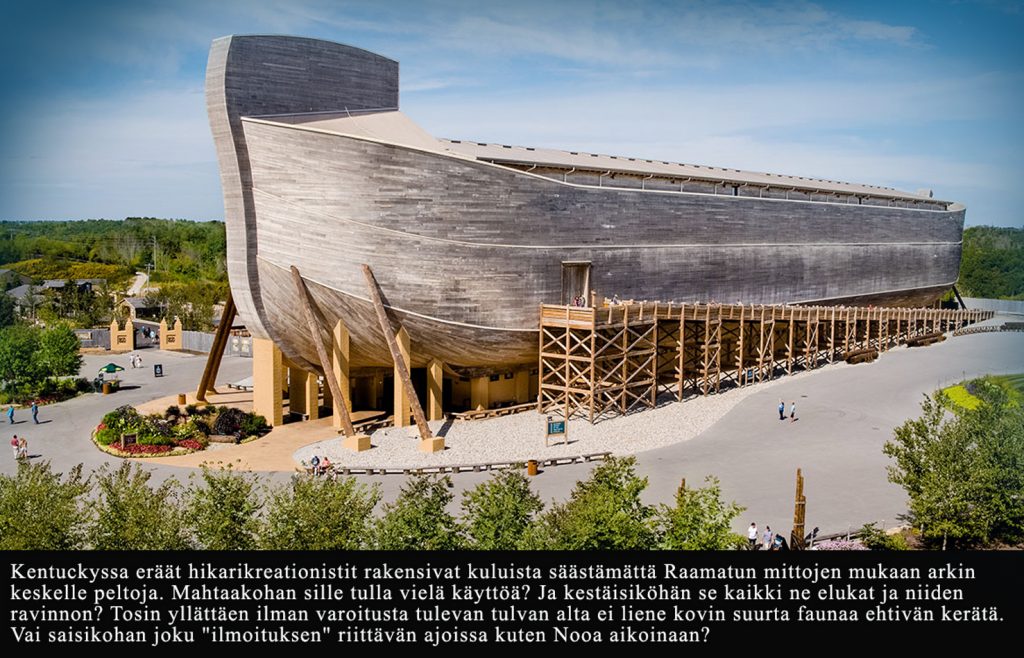 Sitten on vielä yksi kummallisuus. Jumala siis käski Nooan rakentaa arkin. Suuren laivan. 300 kyynärää pitkän, 50 kyynärää leveän ja 30 kyynärää korkean. Kolme kantta ja niissä osastoja eri elukoille. Ja niin se sitten rakennettiin. Työtä riitti, eikä Nooa kolmine poikineen mitenkään olisi onnistunut suurisuuntaisessa projektissa, vaan piti olla muutakin apuvoimaa. Niitä pahoja ja syntisiä, joiden oli määrä hukkua. Kyllä näitä varmasti kiinnosti, miksi niin valtavaa laivaa rakennettiin keskelle kuivaa maata. Mitäs Nooa ja pojat vastaisivat? ”-No, kun tässä pian alkaa vähän tuo veden pinta nousta…” Eiköhän epäilykset olisi alkaneet herätä työporukoissa. Ja eiköhän olisi alkanut vähän paikassa ja toisessa paattien kunnosteleminen ja rakenteleminen.