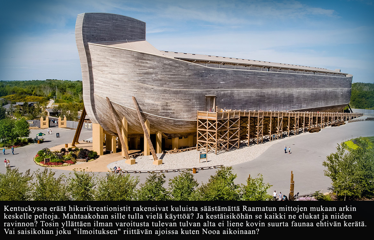 • Kourallinen ihmisiä käytti pronssikautisia työkaluja rakentaakseen suuren puulaivan, johon tungettiin luvuon määrä eläimiä sekä niiden lukuisia erityisiä ruokavalio- ja muita tarpeita kokonaisen VUODEN ajaksi. Tuollainen lasti olisi upottanut laivan heti. Mutta jopa nykypäivän kehittyneillä työkaluilla ja tekniikalla olisi mahdotonta rakentaa näin suurta puulaivaa ilman, että se hajoaisi välittömästi karuissa tulvavesissä.