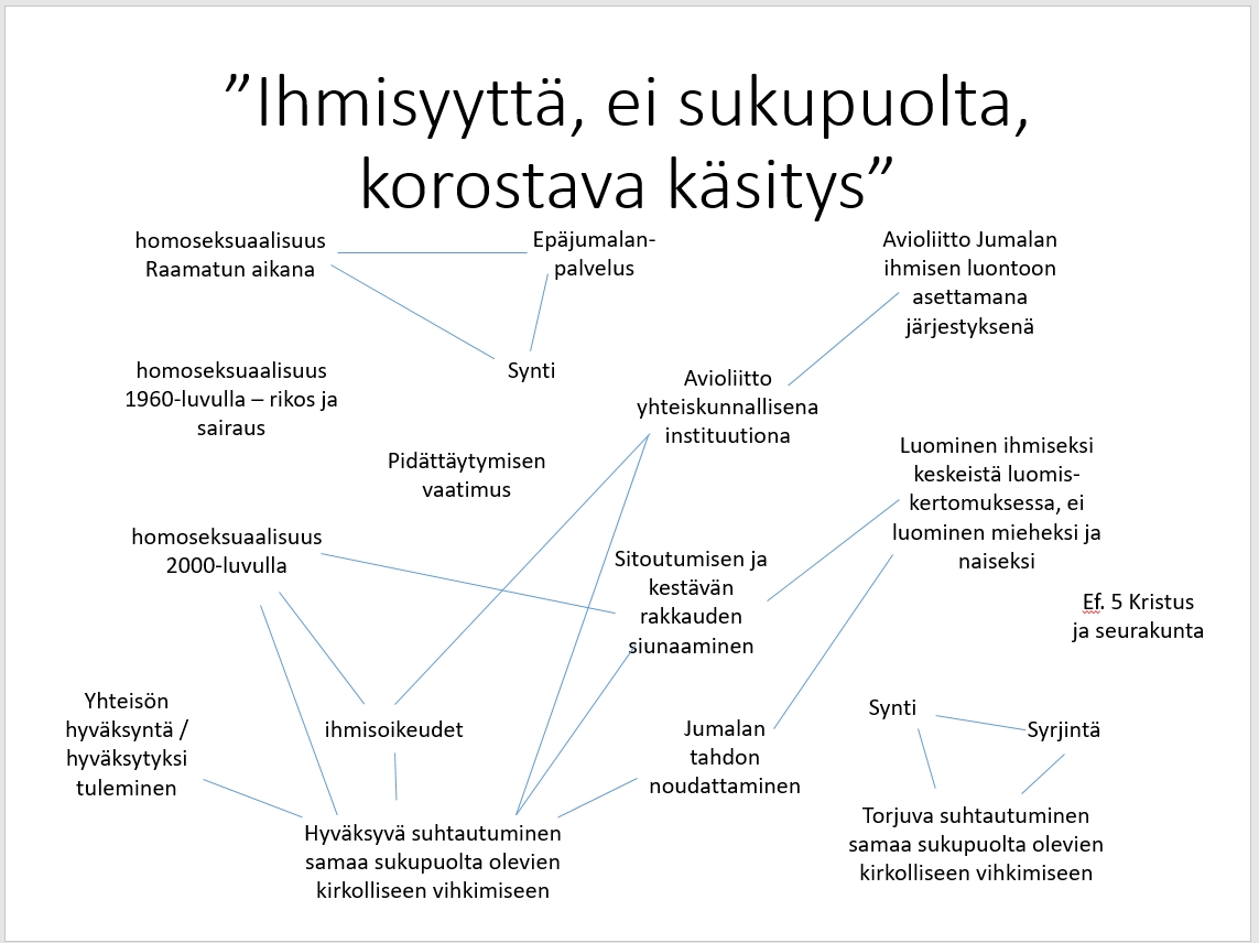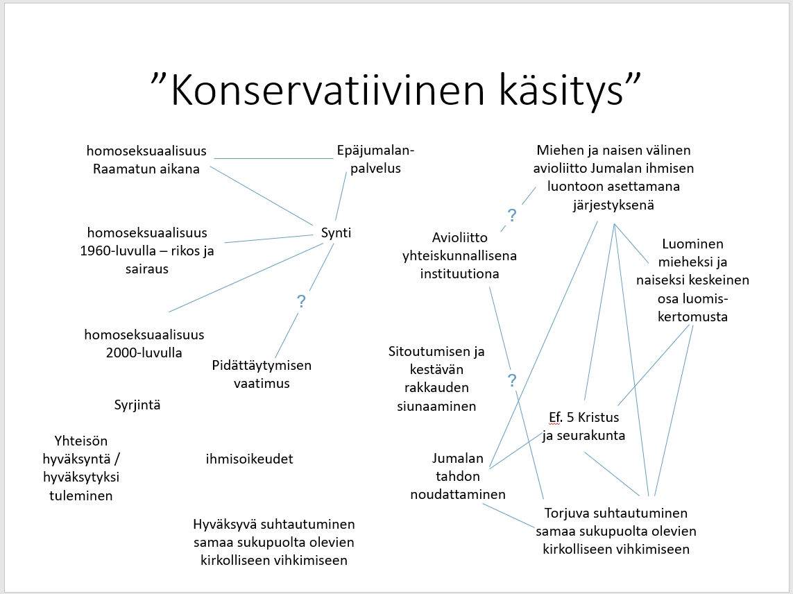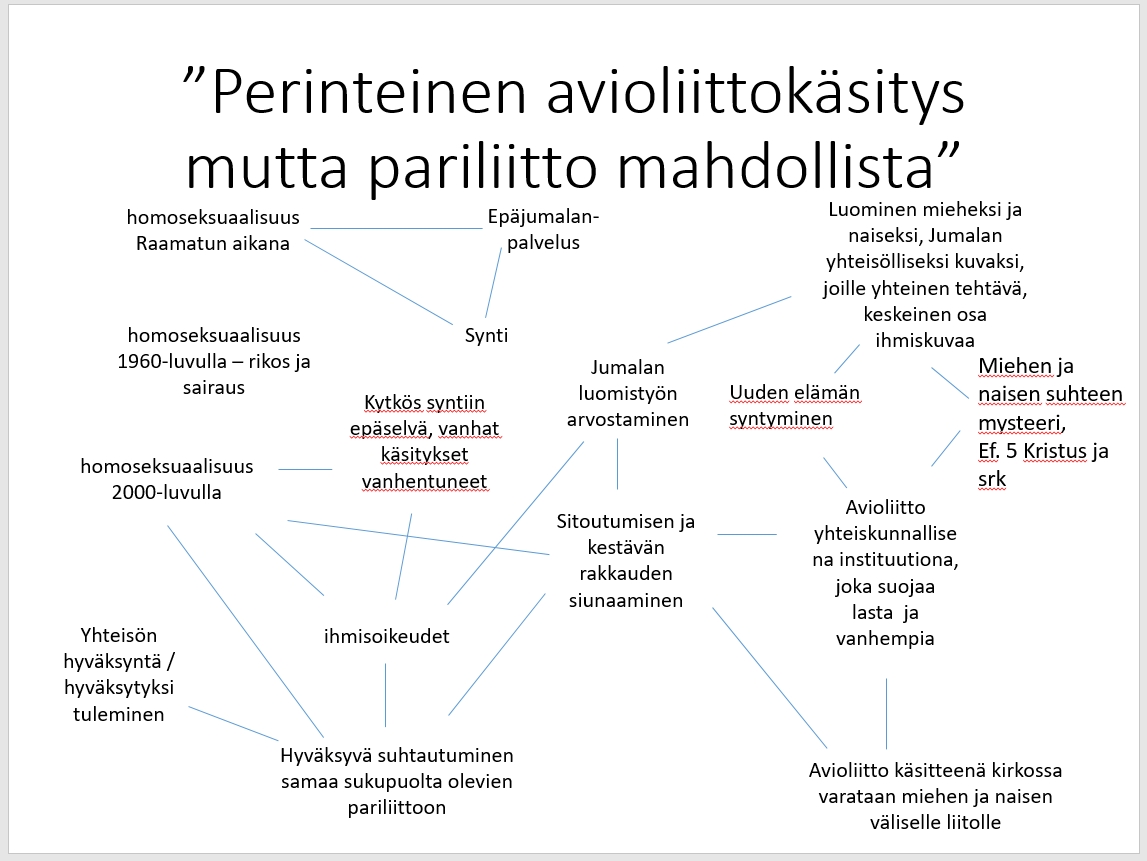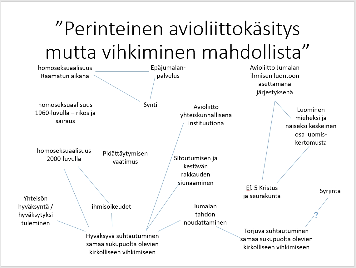 Kirkolliskokouksen perustevaliokunta pohtii näinä kuukausina kirkon avioliittoteologian perusteita. Ajattelen, että perustevaliokunnan täytyy jollain tavalla päättää, edustaako kirkko jotain näistä kolmesta käsityksestä tai kenties jotain neljättä.