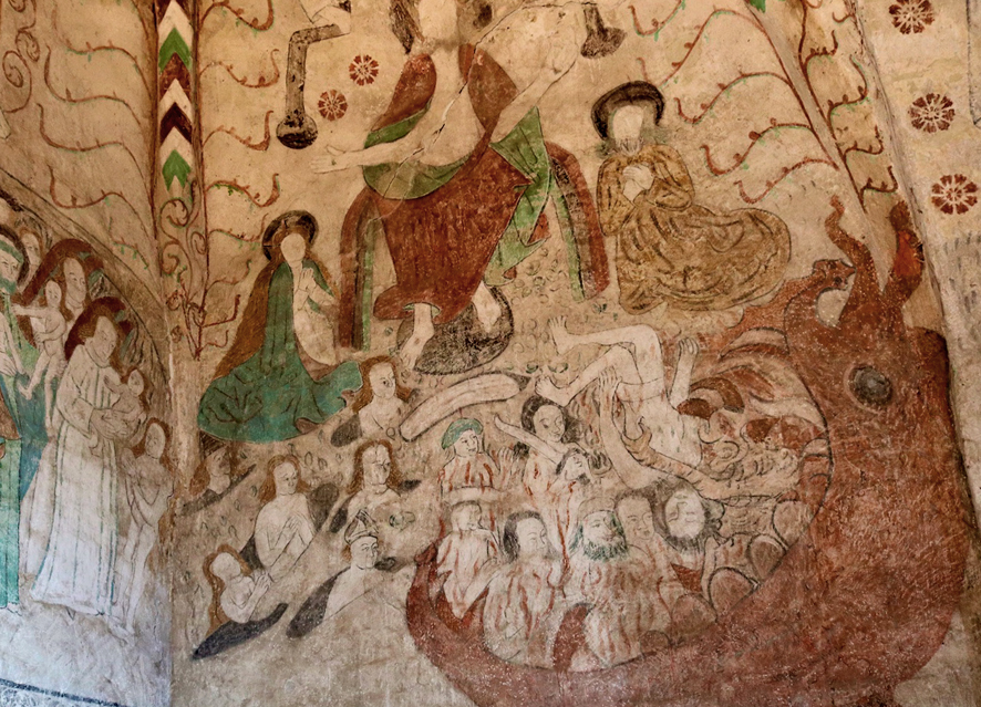 Leviathan on kauhistuttava peto. Valtava, pelottava ja ruma hirviö. Ja sellaisen olennon hyvä Jumalamme loi. ”Siellä kulkevat laivat, siellä on Leviathan, merihirviö, jonka loit telmimään siellä.” (Ps. 104:26). Niinpä niin. Ainahan tarustot ovat olleet väärällään hirmuisia petoja ja toinen toistaan ällöttävämpiä kammotuksia. Mikäpä ettei uskonnoissakin. Ja sellainen hirviö, Leviathan, piirrettiin eräänkin kirkon seinään pelottamaan aikansa ihmisiä. Syntisiä, perisynnin alaisia, jotka voivat pelastua vain ja ainoastaan uskomalla Jeesukseen ja Lunastukseen. Siis uskomalla papin jylhiin synnintunnon vaateisiin ja tuomiopäivän puheisiin. Kuvassa pahat syntiset Leviathan ahmaisee, hyvät eli uskovat pääsevät taivaan iloihin.
