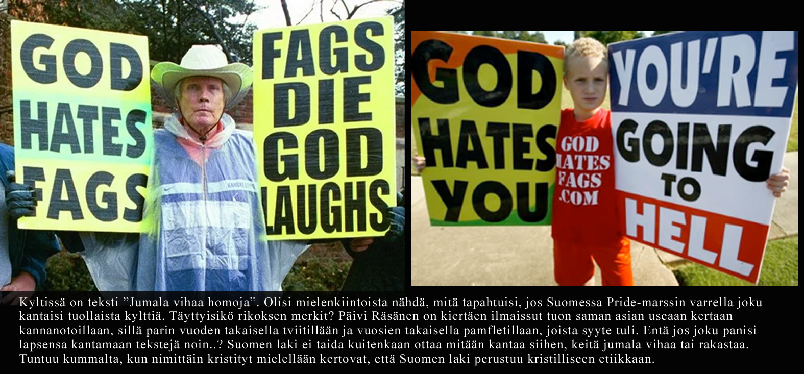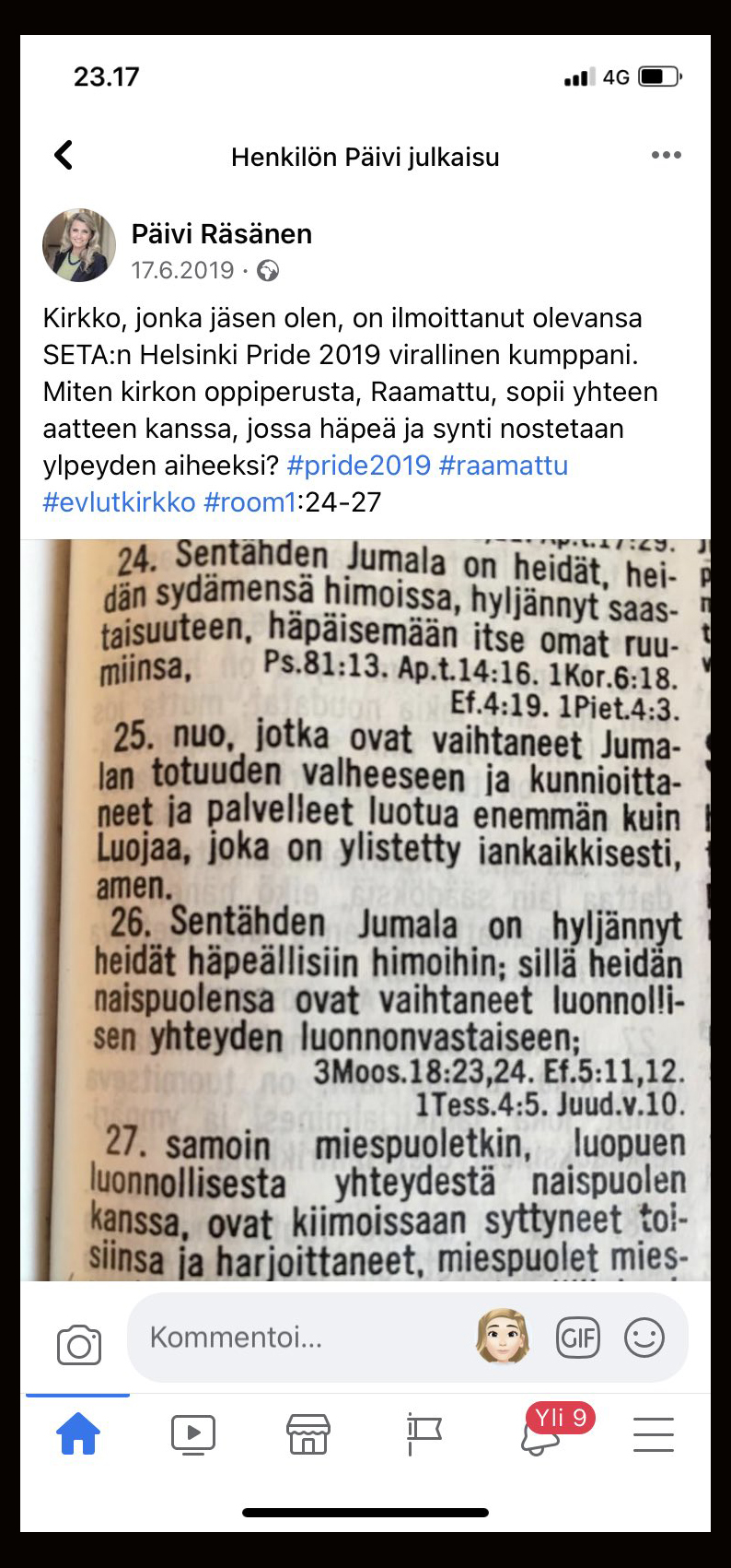 Päivi Räsänen julkaisi tviittinsä nyt 26.6. uudelleen Twitterissä saatteella ”Tämän päivityksen julkaisusta kaksi vuotta sitten lähti liikkeelle prosessi, jossa valmistaudun ensi syksyn käräjille. Kysymys oli mielestäni aiheellinen ja sen takana edelleen seison”. Tulee mieleen uhmaikäinen lapsi. Totta maar hän saa seistä sanomansa takana vaikka päällään. Mutta jos hän kansanedustajana ja tunnettuna vaikuttajana edelleen seisoo seksuaalivähemmistöjä loukkaavan kuvansa takana, on syytä vähintään miettiä, onko tämä tehtäviensä ja vastuunsa tasalla.