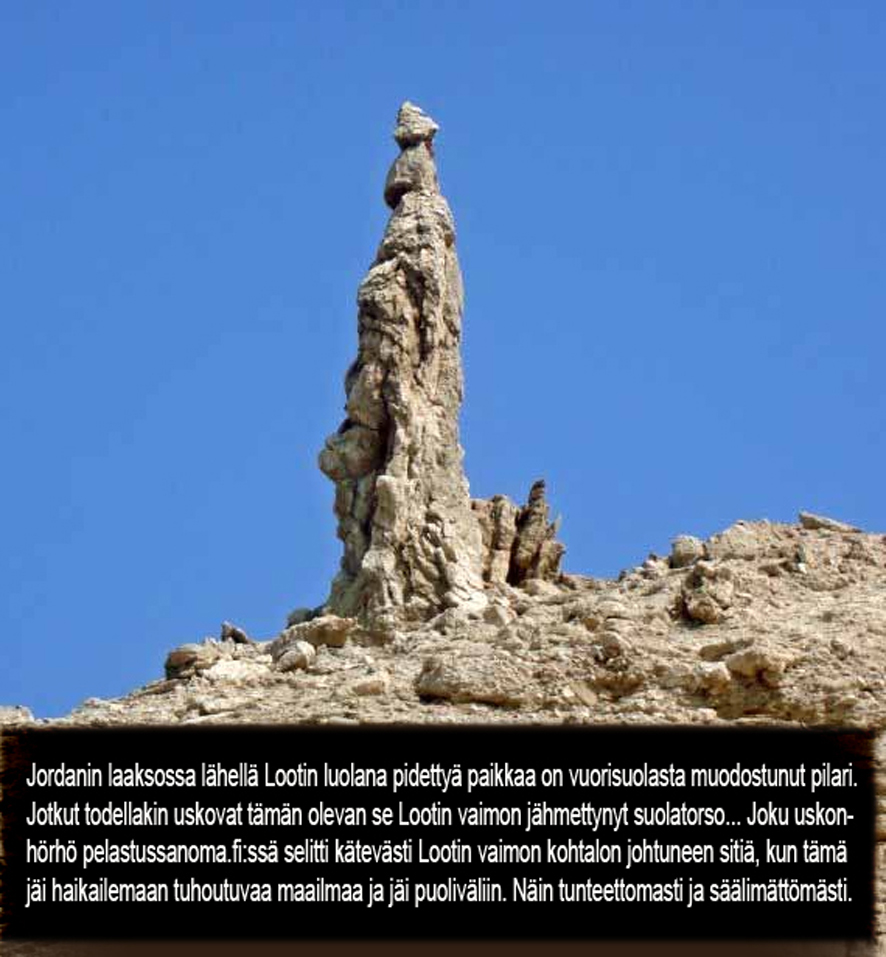 Mietin jälleen, mikä ihmeen järki siinä jumalalla oikein oli, että nyt Lootin vaimoparan suolapatsaaksi muutti. Ja vain siksi, että tämä vilkaisi taakseen. Mitä pahaa siinä nyt oli? Vai oliko se kosto siitä, että tämä vaimo vielä haikaili syntisen kotikaupunkinsa perään? Mies ja tyttäretkin siinä vielä ja näiden silmien edessä. Ei mikään rakastava Isä moista tee.