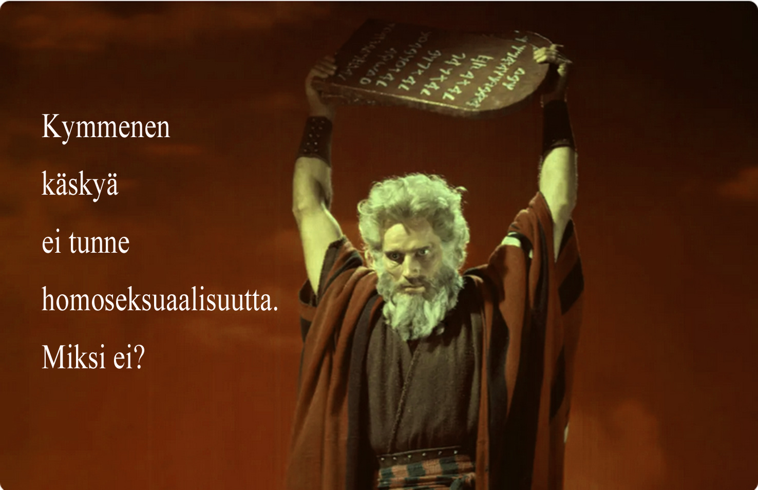 Ymmärrän toki, että kymmenen käskyä ovat eräänlainen tiivistelmä Mooseksen laista, joka käsittää lukuisan määrän määräyksiä ja paragraafeja, joiden rikkomisesta tietysti saa ikuisen Herran kirouksen ja kärsimyksen ja niin edelleen. Vai onkohan tuo homoseksuaalisuus kuitenkin ja sittenkin niin vähäpätöinen asia, että se sai jäädä pois noista kymmenestä tunnetuista käskyistä?