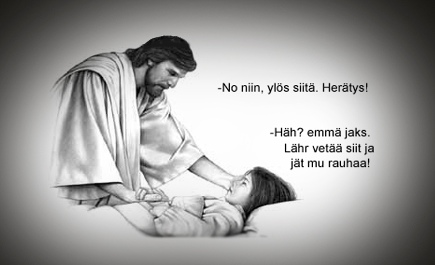 Kun joku kertoo meille kaukaisilla mailla tapahtuneesta kuolleista herättämisestä, toteamme vain, että niin niin, ja lehmätkin lentää. Zombie-elokuviakin on ihan mukava kauhistella. Viihteeksi. Mutta kun Lasarus on ollut haudassa neljä päivää ja Jairuksen tytärkin tunnin pari, tuli Jeesus, lausui manaukset ja katso: molemmat heräsivät henkiin. Ja näiden on oltava totista totta, koska se Raamatussa niin kerrotaan. Ja Raamattu on Jumalan sanaa. – Lasarus muuten heräsi kalmosta eläväksi vain Johanneksen evankeliumissa. Siinä viimeiseksi kirjoitetussa. Kummallista, että tuo melkoinen ihme kolmesta aiemmasta unohtui. Vai epäiliköhän niiden kirjoittajat sitä vai mahtoiko Johanneksen kirjoittaja päästää mielikuvituksen laukalle?