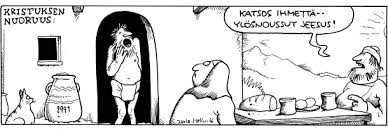 Jeesuksen ylösnouseminen se vasta ihme onkin, kuten alla olevasta Jarlan Fingerpori-stripistä ilmenee. Ainakin omilla pojillani se näin yleensä tahtoi olla.