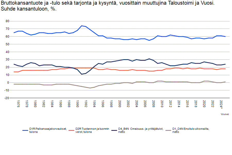 Jos tuohon lisää vielä tuotannon ja tuonnin verot, tulona -sarjan pääsee lähelle 100% kansantulosta.