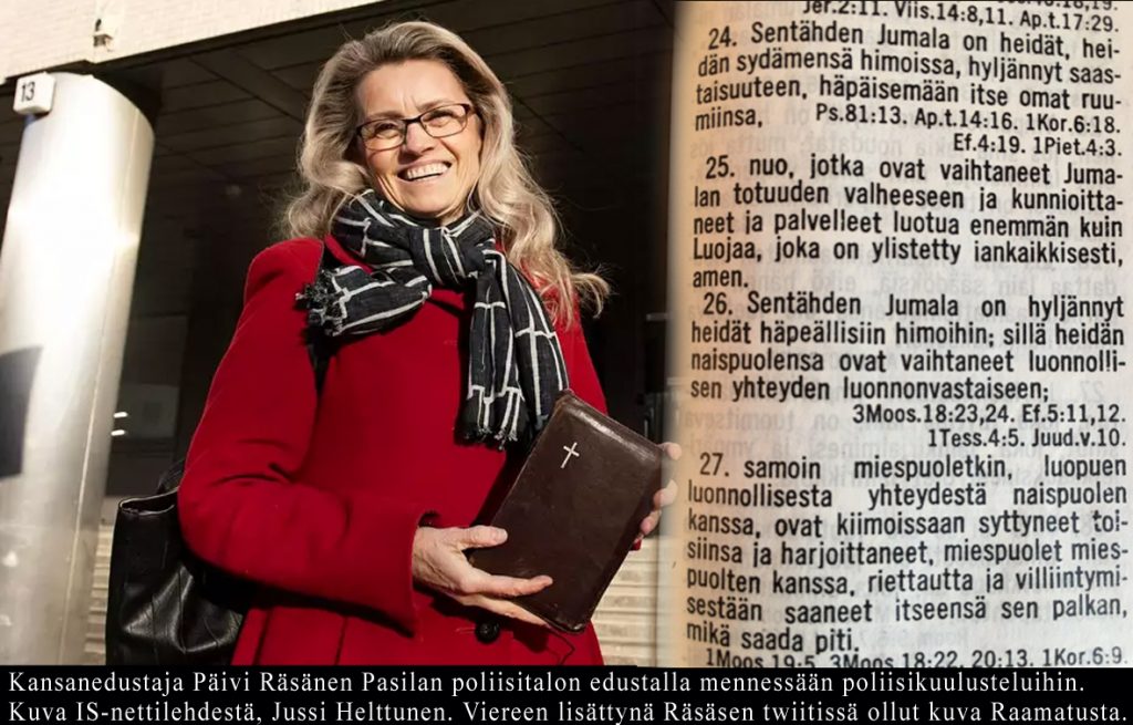 Uskontoa käytetään politiikan välineenä ja politikkaa uskonnon välineenä. Eihän tässä ole mitään uutta. Näillä keskusteluilla on viihdearvoa . Itse en odota joltakin Räsäseltä muuta kun juuri tuollaista tekstiä. Huonona ihmisenä tulen vahingoniloiseksi siitä että he ovat paljastaneet tapansa ajatella jälleen kerran. Parannusta he eivät tule tekemään, ei edes oikeuslaitoksen vaatimuksesta.